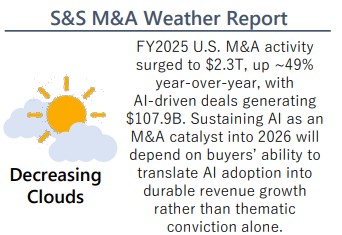 - Late-2025 valuations assumed a predictable rate path; with Trump's Fed Chair nominee Kevin Warsh bringing increased likelihood of further rate cuts in 2026, tech M&A may see additional stimulus.