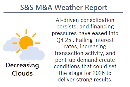 for ~22% of 2025 global deal volume. - Financing tailwinds continue to strengthen in December. The Fed’s third consecutive rate cut to 3.50% - 3.75%, and tightening U.S. leveraged-loan spreads, are tilting deal terms toward borrowers, driving scale and participation in SaaS acquisitions.