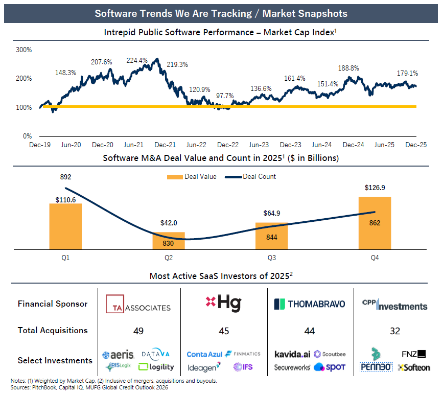 - Software M&A delivered 74 megadeals surpassing $5 billion in 2025. With AI-related transactions accounting for more than 20% of deal volume, reflecting continued confidence in AI despite bubble concerns.