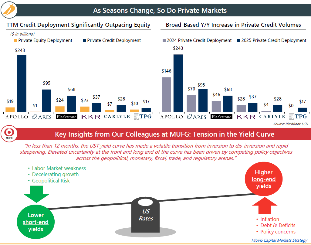 To every market, turn, turn, turn… Just as the seasons shift, so does the capital landscape. A snapshot of the large-cap asset manager ecosystem shows a rapidly diversifying color scheme of investment allocations. Deployments into private credit continue to outpace traditional private equity, demonstrating a structural shift in how asset managers see the broader opportunity set in the U.S. private markets.